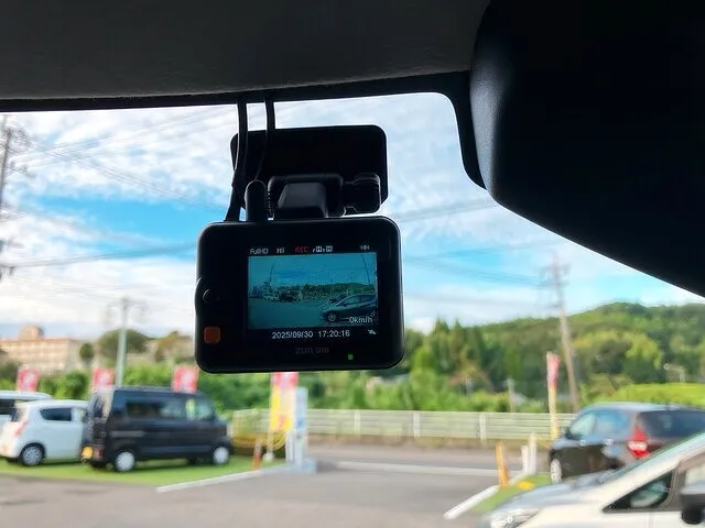 車内から見上げると、フロントガラスにしっかりと取り付けられたドライブレコーダーが目に入ります。